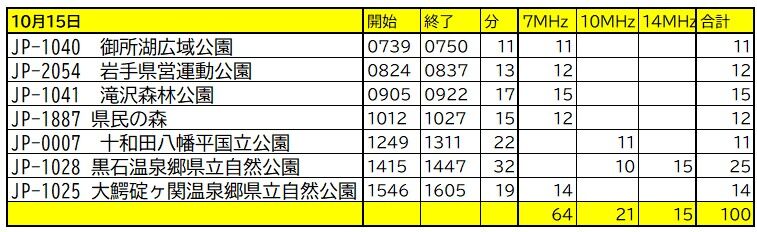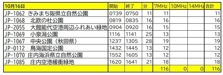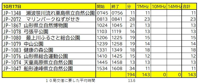 埼玉県新座市 10:34 ぐんまBB54 群馬県桐生市 M5/M5 特小赤城RPT 10:54 いばらきY44 茨城県つくば市 56/57 DCR44ch 11:04 いばらきKC101 栃木県足利市妙義山 59/56 DCR14ch 11:38 とうきょうYM137 埼玉県北葛飾郡松伏町緑の丘公園 57/57 DCR72ch 12:09 おきなわOS404 沖縄県石垣市 55/56 CB8ch 12:35 とうきょう13131/JR6 沖縄県石垣市 55/56 CB3ch 12:43 とうきょう13131/JR6 沖縄県石垣市 55/55 CB3ch