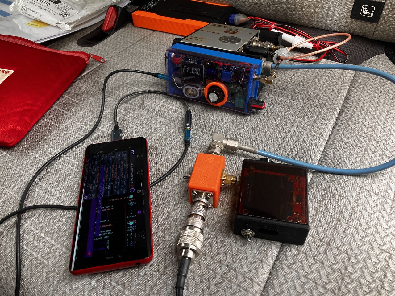 ということで、結局モービル版なんだけれど、<デジコミの部>は外で運用することになりました。万が一雨が降ってきたらすぐにモービルに逃げ込む体制で。ちなみにやたら明るいのは、わたしの軽四のヘッドライトで明かりをとっているためです。