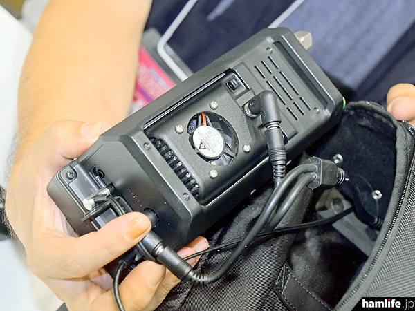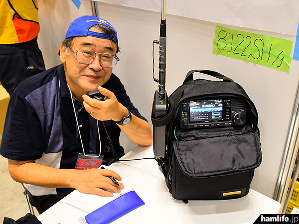 3エリア 6mAMロールコールグループ(ブース番号:C-30)でゲリラ運用を行っていた「8J22SH」。IC-705に電池パックを改造したというファンを装着し、超レアな50MHz帯のAMモードでオンエアーしていたが、相手局がいたかは不明。