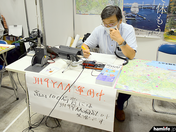 JARL高岡クラブ(ブース番号:J-43)で運用していた「JH9YAA」。「富山100局賞にはJH9YAAのQSLカードが必要です」と案内していた。アワードハンター向けの粋な計らいだと言えるだろう。