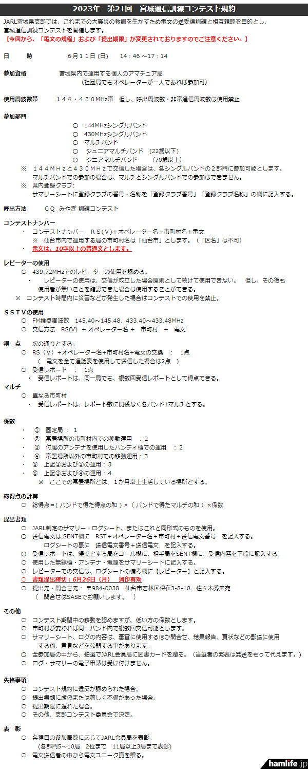 ログシートの締め切りは6月26日(月)消印有効。ログ・サマリーの電子申請は受け付けない。全参加局の中から、抽選でJARL会員局に図書カードを贈られる。また、電文送信者の中から電文ユニーク賞を贈るとしている。詳しくは「2023年 第21回 宮城通信訓練コンテスト規約」で確認のこと。