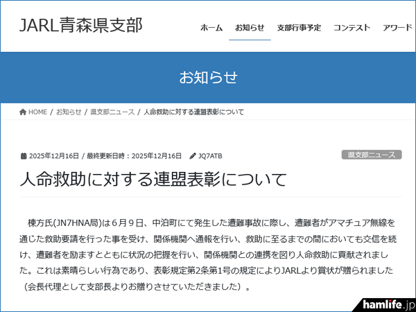 5位には、2025年6月9日に青森県中泊町にて発生した遭難事故において、アマチュア無線を通じて、遭難者からの救助要請の対応とともに、関係機関との連携を図り人命救助に貢献したとして、一般社団法人 日本アマチュア無線連盟(JARL)会員でもある棟方武司氏(JN7HNA)に対し、JARLから連盟表彰が行われたニュース。hamlife.jpでは遭難事故後に棟方さんご本人に連絡を取り、当時の様子や救助後に提出した東北総合通信局への「非常通信実施報告書」作成作業など、貴重なやり取りをまとめた手記(時系列)を別記事(2025年7月3日記事)で紹介している。