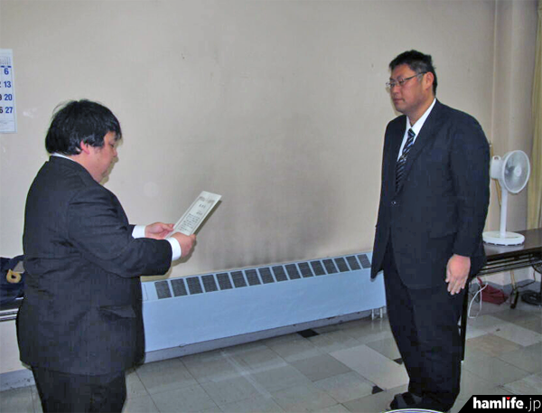 5)<青森県支部長が賞状を伝達>JARL、アマチュア無線で人命救助に貢献した棟方さん(JN7HNA局)を連盟表彰