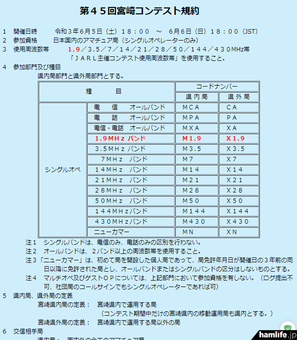 <1.9MHz帯を追加、シングルオペのみ>JARL宮崎県支部、6月5日(土)18時から24時間「第45回 宮崎コンテスト」を開