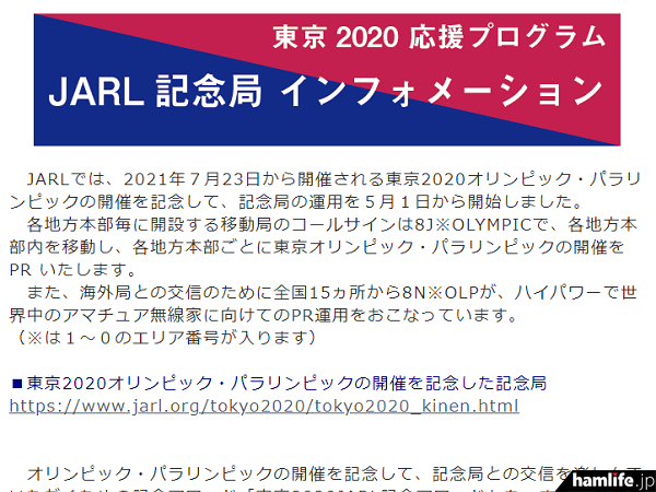 2)<東京2020応援プログラム> JARLが開設するオリンピック・パラリンピック特別記念局「8J※OLYMPIC」「8N※OLP」が5月1日からオンエアー