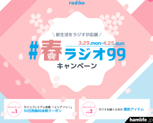 3位は、2021年3月29日から4月25日まで、パソコンやスマートフォンでラジオが聴けるサービス「radiko(ラジコ)」が、放送エリアを越えて全国すべての民放ラジオ(計99局)を楽しめる「エリアフリー聴取」の30日間無料体験クーポンを先着9,999名に配布する「#春ラジオ99キャンペーン」を実施中という情報だ。現在、radikoは全国すべての民放ラジオ(計99局)が配信に参加。放送大学やNHKラジオ第1とNHK-FMも配信し、月間利用者数はコロナ禍以降急増、1,000万人に迫る勢いだという。スマートフォンのアプリなどを使って誰でも利用できるが、無料で受信できるのは「現在いるエリアの地元ラジオ局」「全国放送であるラジオNIKKEI(第1・第2)と放送大学」「エリア内のNHKラジオ第1とNHK-FM」に限られる(NHKはタイムフリー非対応)。しかし、月額385円(税込)のプレミアム会員になると、日本全国の民放ラジオ局すべてが聴き放題(エリアフリー聴取)になる。現在のプレミアム会員数は約87万人と伝えられている。radikoには申し込みが殺到し9,999名分のクーポンを配布したが「好評につき延長中」として、現在もクーポン発行を続けている。