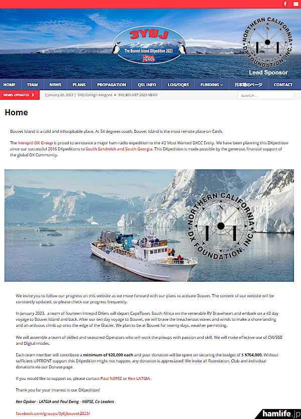 続く2位は、「<2023年1月に出発>日本人OPも参加! DXCCウォンテッドランキング2位のブーベ島『3Y0J』DXペディション計画が始動」。世界中のDXerからの要求度が高いエンティティの1つ、南大西洋の“世界で最も人里離れた孤島”と言われる「ブーベ島」(ノルウェー領)から、実現すれば、1990年にあった「3Y5X」DXペディション以来、実に33年ぶりのサービスとなる計画が発表された。2021年4月3日にIntrepid-DX Groupが開設した「3Y0J-Bouvet 2023 DXpedition」の公式Webサイトで「2023年1月、14人のIntrepid DXerチームが、南アフリカのケープタウンを出発し、ブーベ島への42日間の航海に乗り出します。ブーベ島への10日間の航海のあと天候が許せば20日間、現地に滞在する予定です」と説明。14人のチームメンバーには、日本人の田中 純一氏(JH4RHF/OE1ZKC)が参加している。