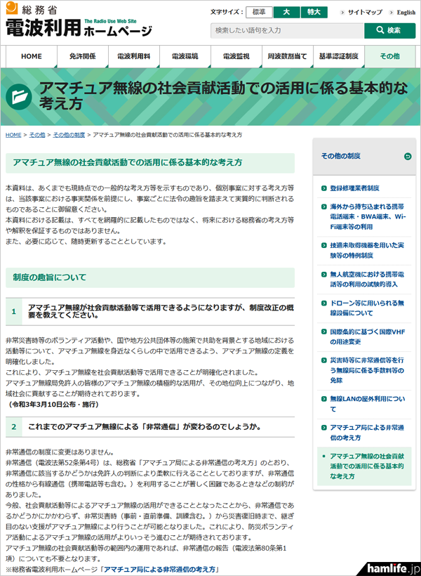 総務省は2021年3月10日夕方、電波利用ホームページに「アマチュア無線の社会貢献活動での活用に係る基本的な考え方」と題した資料を掲載した。この日の朝に電波法施行規則の改正等が行われ「アマチュア無線の社会貢献活動での活用」「小中学生のアマチュア無線の体験機会の拡大」が施行されたことに基づくもの。同資料には「制度の趣旨について」「社会貢献活動等について」「アマチュア無線の使用にあたって」「実際の活動にあたって」「電波法令違反等の対応について」など全6ジャンル17項目をQ&A形式で掲載している。