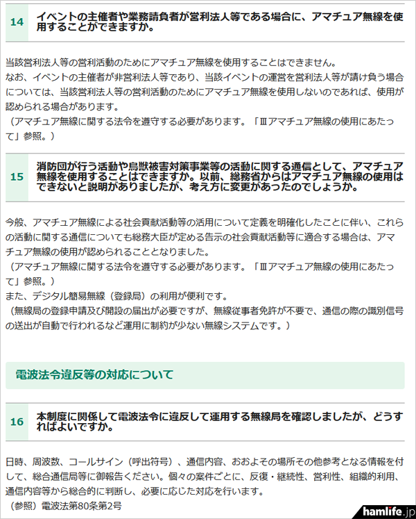 (14)イベントの主催者や業務請負者が営利法人等である場合に、アマチュア無線を使用することができますか。