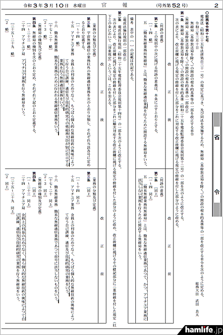 総務省は2021年3月10日、「有資格者が一定条件下で、アマチュア無線を災害ボランティア、地域ボランティア活動などの通信にも利用できる」「無資格者の小中学生は、家族が開設するアマチュア局や在籍する学校のクラブ局、学校教職員のアマチュア局から交信体験が可能」という2点を骨子とする電波法関連省令・告示を同日付の官報に掲載、いずれも即日施行された。