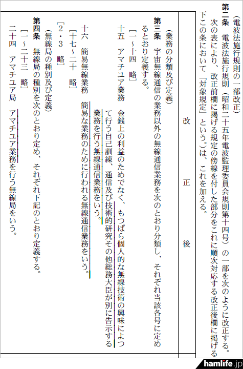省令の改正で「アマチュア業務」の定義が変更され「金銭上の利益のためでなく、もつぱら個人的な無線技術の興味によつて行う自己訓練、通信及び技術的研究その他総務大臣が別に告示する業務を行う無線通信業務をいう」となった