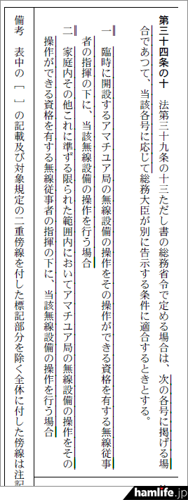 省令の改正で無資格者がアマチュア局を運用できるケースに「家庭内その他これに準ずる限られた範囲内においてアマチユア局の無線設備の操作をその操作ができる資格を有する無線従事者の指揮の下に、当該無線設備の操作を行う場合」が加わった