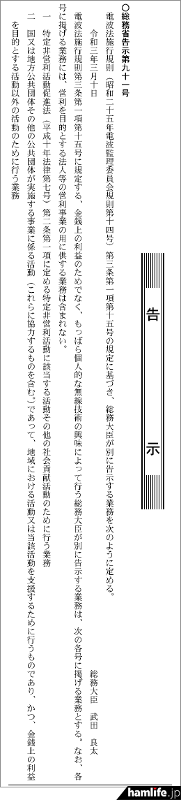 総務省令で改正された「アマチュア業務」で、“その他総務大臣が別に告示する業務”とされた内容(特定非営利活動、社会貢献活動、地域活動など)を告示で定めた。「なお、各号に掲げる業務には、営利を目的とする法人等の営利事業の用に供する業務は含まれない」と明記した