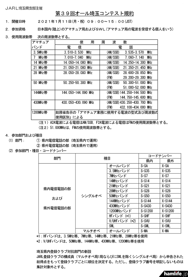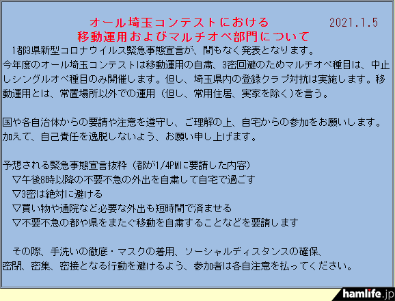 <緊急事態宣言に伴いマルチオペ種目中止>JARL埼玉県支部、1月11日(月・祝)9~15時に「第39回 オール埼玉コンテスト」を開催