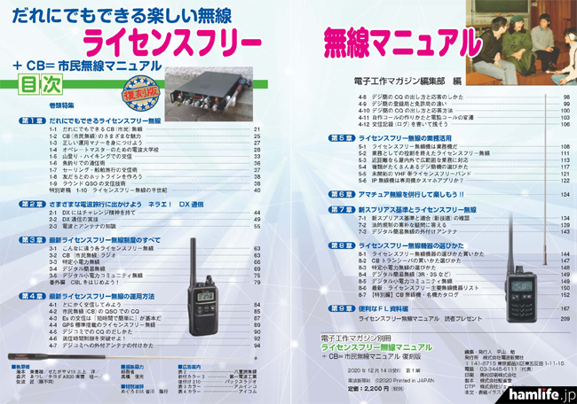 電波新聞社は1979(昭和54)年にめぐろE55/JH1IUR 皆川隆行氏の執筆で刊行し、合法CB無線入門ブームの発火点となった名著「CB=市民無線マニュアル」をこのほど現代版として復活、「ライセンスフリー無線マニュアル」のタイトルで2020年12月14日に発売することを発表した。総ページ数は208ページ(うちカラー16ページ)、価格は2,420円(税込)。