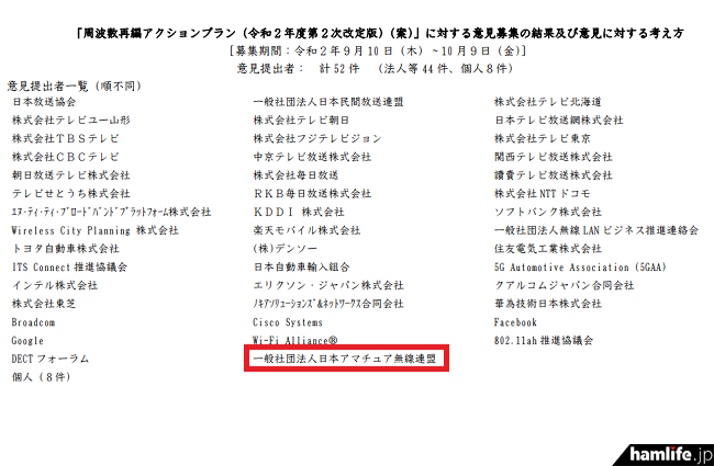 先週のアクセスランキング1位は、総務省総合通信基盤局電波部電波政策課が行った「周波数再編アクションプラン案(令和2年度第2次改定版)」に対するパブリックコメント募集(集まった意見は52件>法人等44件/個人8件)に対して、一般社団法人 日本アマチュア無線連盟(JARL)が「5MHz帯(60mバンド)におけるアマチュアバンド割当要求」の意見を提出していたことが、この度公開された資料から判明したというニュース。寄せられた個人からも同様の意見が十数件確認できた。