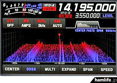 FTDX10のディスプレイには、高精細5インチワイドタイプのフルカラータッチパネルを採用しています。通過帯域の状態を示すフィルター表示や受信動作状態(AT/GAIN/AGCなど)の情報は画面中央に配置し、優れた視認性を提供すると共にタッチパネルによる直感的な操作が可能になります。リアルタイムスペクトラムスコープ表示は、FTDX101で新たに開発された3DSS(3-Dimensional Spectrum Stream)に対応しており、バンド全体の信号強度の変化を3D表示することで、刻々と変化するバンド内の信号の状況を瞬時に把握することができます。