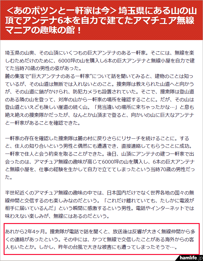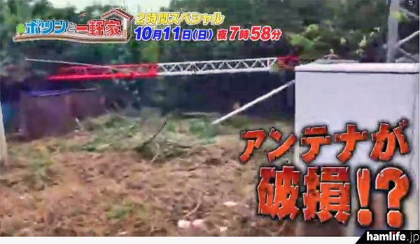 今回の2時間スペシャルでは再び同氏のシャックとアンテナを紹介し、電話でインタビューを行ったが「昨年の台風で大きな被害にも遭ってしまった」という報告と、衝撃の映像が登場するらしい。