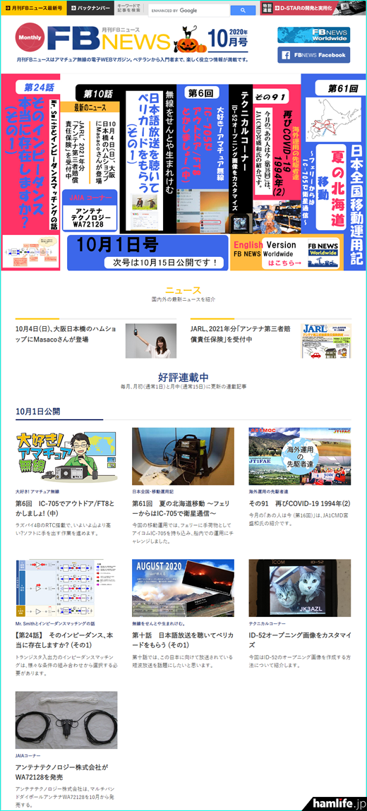 「アマチュア無線に関する最新情報を提供し、アマチュア無線のおもしろさを伝える電子マガジンで、スポンサーメーカーだけではなく、JAIA会員各メーカーの製品情報も掲載しています」という電子Webマガジン「月刊FBニュース」。通常は“毎月1日”と“毎月15日”に記事の更新を行っているが、きょう2020年10月1日には ニュース2本のほか、 「無線をせんとや生まれけむ。」「テクニカルコーナー」「海外運用の先駆者達」「日本全国・移動運用記」など7本の記事を更新した。また英語版の「FB NEWS Worldwide」にも4本の記事が掲載されている。