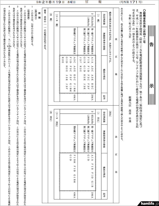 そのため総務省は、1.8MHz帯で新たにSSBなどの音声通信等を行う際の免許手続の簡素化を目的とした告示の改正案を作成。パブリックコメント(意見募集)を経て、きょう8月19日に総務省告示第242号として官報で公布、即日施行された。