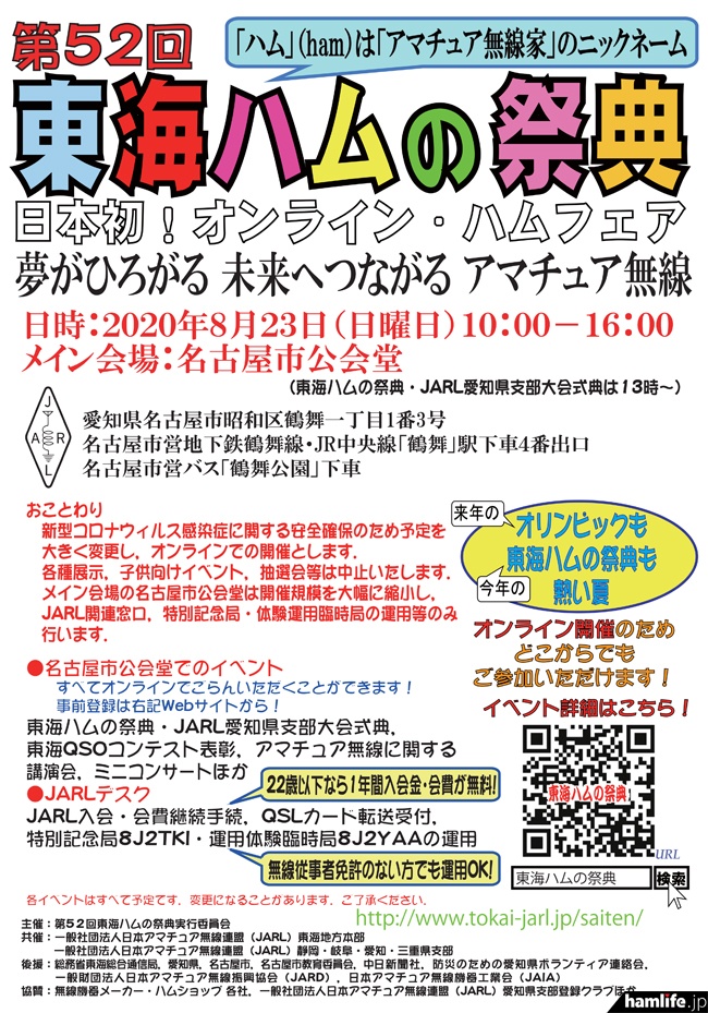 一般社団法人 日本アマチュア無線連盟(JARL)の東海地方本部と静岡・岐阜・愛知・三重県支部の共催で毎年行われているイベント「東海ハムの祭典」だが、 既報のとおり 今年は新型コロナウイルスの感染拡大防止のため、2020年8月23日(日)の10~16時にZoomウェビナーとYouTubeを使用したオンラインで開催されることになった。