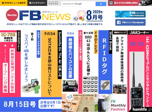 アマチュア無線の電子マガジン「月刊FBニュース」は、毎月1回行う連載記事の掲載タイミングを見直し、2017年10月からは“毎月1日更新”と“毎月15日更新”のバランスを考慮するようになった。きょう2020年8月17日には新たにニュース1本が掲載されたほか、お馴染みの連載「Summits On The Air (SOTA)の楽しみ」「FBのトレビア」「車内シャックの構築と運用」「テクニカルコーナー」など合計10本の連載記事が公開された。