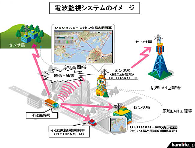 注:電波監視システム(DEURAS:デューラス)は、道内各地に設置したセンサ局(受信設備)を札幌のセンタ局で集中制御して電波の解析や発射源の探査を行うものです。