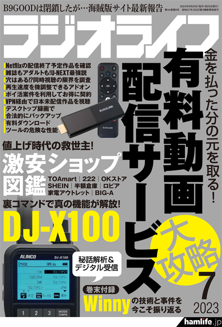 3位は、アルインコ株式会社から発売された(4月19日メーカー出荷開始)、各種デジタル波に対応するハンディタイプの受信機「DJ-X100」に関して、「周波数シフトを±90MHzから±400MHzに拡大」「近日公開予定のメモリー編集ソフトと位置表示ソフトへの対応(現在公開中の“メモリーエディターbeta01”編集ソフトは更新後もそのまま使用可能)」「その他動作の軽微な修正」の3点に対応する新ファームウェアが公開された記事だ。「DJ-X100」は発売後もチップ部品の取り外しや隠しコマンドなどで機能アップが図れる。5位にランクインした月刊「ラジオライフ」2023年7月号の誌面では、第3特集で「裏コマンドで拡張モードに突入! DJ-X100」と題して、DJ-X100の機能を拡張する“裏コマンド”から開発インタビューまで、25ページにわたって掲載している。