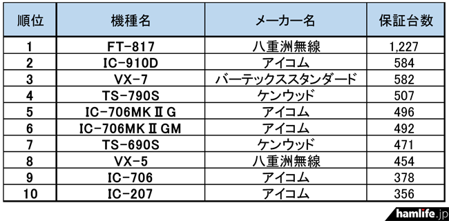 1)<今でも多く利用されている古い無線機は?>JARD、「スプリアス確認保証機種」の “トップ10” を公表