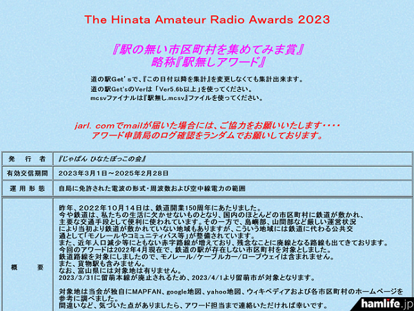 毎回、趣向を凝らしたルールのアワードを発行して人気を集めている「じゃぱん ひなたぼっこの会」は、新たに2023年3月1日から2025年2月28日までの2年間の交信が有効で、鉄道の駅が存在しない市区町村(2022年4月現在)との局と交信して得られる「駅の無い市区町村を集めてみま賞(略称「駅無しアワード」)」の発行を2年間限定で始める。これは、昨年(2022年)10月14日に鉄道開業150周年を迎え話題になったが、今や鉄道は私たちの生活に欠かせないものである一方で、人口減少などにともない赤字路線が増え廃線となる路線や、当初より鉄道が敷かれていない地域に注目したアワードだ。部門は「300賞」「486賞」「デジタル300賞」「デジタル486賞」の4つで、申請の受付期間は2023年4月1日から2025年3月31日までの2年間。申請料は電子メールでの受け取り(PDF形式)は無料。印刷したアワードを郵送で受け取る場合は300円となっている。