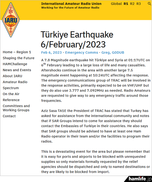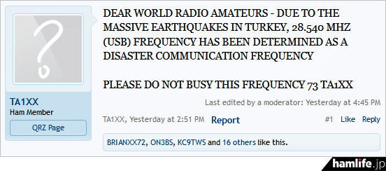 2)<7.092MHz、28.540MHzをクリアに!>トルコのM7.8大地震で同国のアマチュア無線家とIARUが「非常通信用周波数」を告知