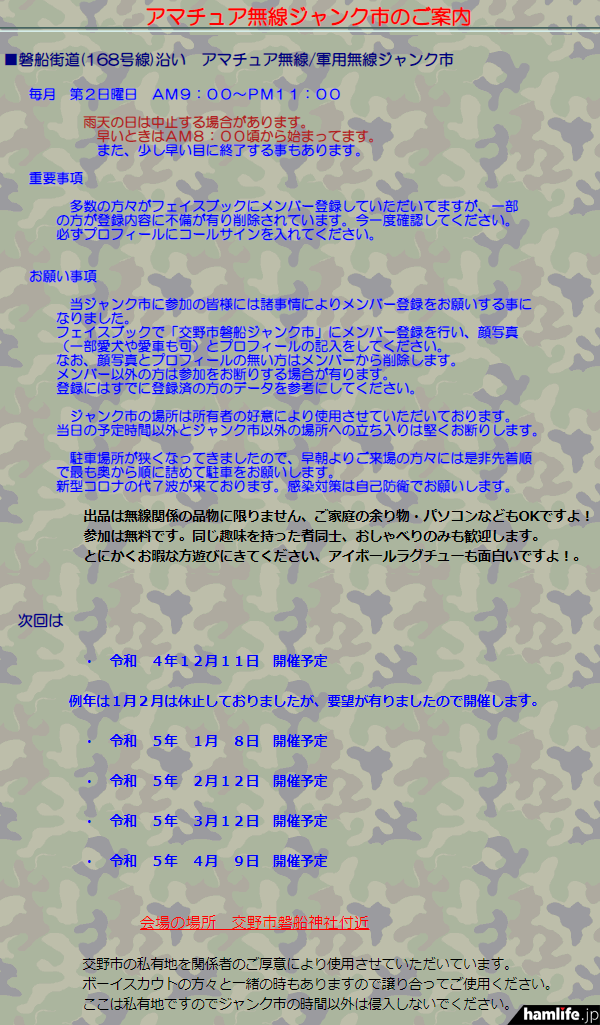 Facebook「交野市 磐船ジャンク市グループ」にアクセスすると、主催者から「交野市磐船ジャンク市グループの皆さんに4月以降約10年間続いたジャンク市を完全に終了して閉場するつもりでしたが、たくさんの皆さんから止めないで続けて欲しいと言うメールを貰いました。又、顔写真やプロフィールの件はセキュリティの意味から当然だとも言われている方が多いです。以上の事から3月に申し上げたように、フェイスブックから交野市磐船ジャンク市にメンバー登録して頂き顔写真(一部愛犬や愛車等可能)とプロフィールの記入をして下さい。写真とプロフィールの無い場合メンバー登録の削除をしますので。登録されている方の内容を確認して参考にして下さい。個人的に色々言われる方が有りましたらジャンク市はすぐに閉場致します(私も年齢的にしんどいですから考えたく無いので)」「メンバー登録をして頂く方が増えて来ていますが、プロフィールにはコールサインは必ず入れて下さい。入って無い場合はメンバー登録を削除します」といった案内(2022年3月23日)が書き込まれているので、必ず事前に確認しておこう。