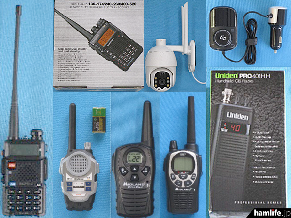 今回の試買テストで、電波法で定める無線局の免許が不要となる「発射する電波が著しく微弱な無線局」の許容値を越えていることが判明した無線設備の一部。見覚えのある中華製のV・UHF帯トランシーバーなども見られる