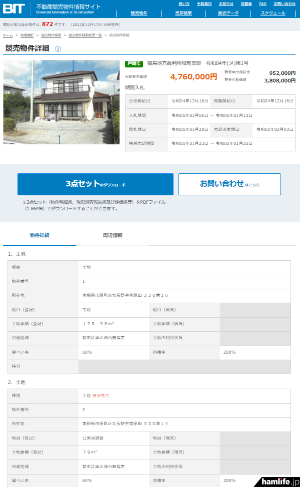 最高裁判所からの委託を受け、株式会社日立社会情報サービスが運営する「不動産競売物件情報サイトBIT」に、福島地方裁判所相馬支部が担当する競売物件として、福島県南相馬市の宅地と家屋(居宅)が売却基準額476万円で掲載された。