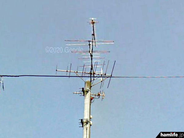Googleストリートビューで確認できた、コンクリート柱のトップに設置されていたV/UHFテレビ用アンテナ2組は、それぞれ別の方向を向いている。トップにあるUHF帯用テレビアンテナは多エレメントの遠距離用なので、隣県である宮城県のテレビ放送を受信する目的かもしれない(2013年6月撮影/Googleストリートビュー画像の一部抜粋)