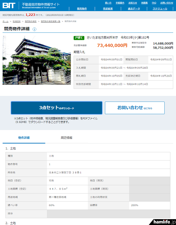4位は、元の所有者はアマチュア無線家だったと見受けられる中古物件が、国が運営する「不動産競売物件情報サイトBIT」に掲載された話題。公表された情報から、所有者が死亡し相続放棄の申述期限(3か月間)が経過したことにより競売(売却基準額:7,344万円)にかけられたと思われる、敷地内にエレベータ付きの自立タワーとアンテナ、和風建築の建物2棟と鉄骨2階建ての事務所(倉庫、車庫)、軽量鉄骨の物置。さらに敷地面積が約400坪もある大邸宅であることが判明。Googleストリートビューで現地の様子を確認すると、自立タワーにはエレベーターで下ろされているが、アンテナは50MHz帯の7エレ八木のスタック、HF帯のV型ダイポール、430MHz帯の13エレ八木スタックなどを見ることができた。