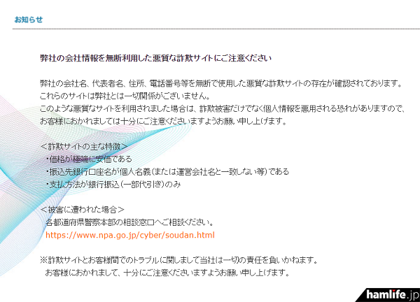 フィッシング詐欺が疑われる怪しい無線機通販サイトの出現は後を絶たないが、また読者情報で「同じような作りのサイトを見つけました」との投稿をいただいた。盗んだ画像を使いまわしているのか、同じ作りをしたコピー通販サイトの数々。お約束通り販売価格は大幅値引きをうたっている。それぞれの「会社情報」を確認すると、実在する会社名や住所が記載されているので悪質だ。検索サイトで会社名を調べても、実在する会社がヒットするケースが多く、詐欺サイトだと判別しづらい。「弊社の会社情報を無断利用した悪質な詐欺サイトにご注意ください」というお知らせを明記しているサイトもあった。