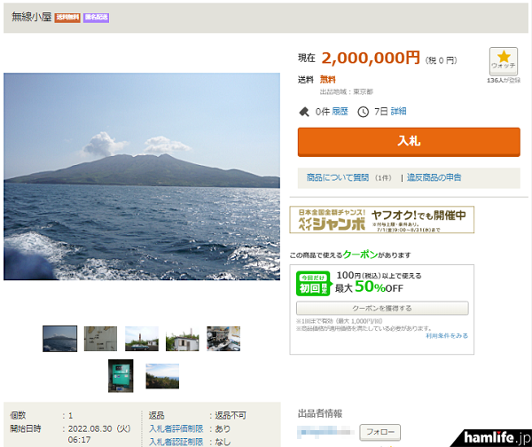 200万円からとして、三宅島の「無線小屋」がヤフオクに出品された。「元気なハムでサイト再建できる方、リモートサイトなど利用したらいかがでしよう」との出品者からのコメントが書かれている(ヤフオクの画面から)