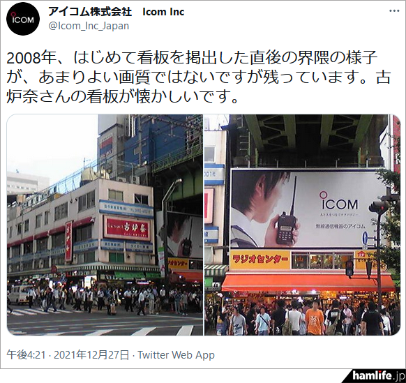 さらにアマチュア無線家にはおなじみの、東京・秋葉原電気街(JR総武線ガード下)と大阪・日本橋電気街(デジハムサポート)に2008年から掲出している同社広告も、2022年1月下旬から東京駅と同一デザインのものに変更される予定という。アイコムの公式Twitterアカウント(@Icom_Inc_Japan)は12月27日に、秋葉原電気街の同社広告について写真入りで紹介している。