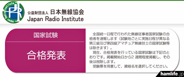 ・国家試験の合格発表(公益財団法人 日本無線協会)