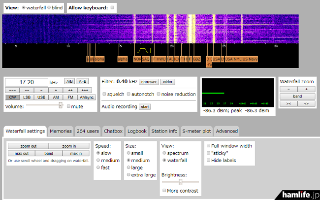 ※オランダの「Universiteit Twente(トゥウェンテ大学)」が開設しているSDRラジオで、日本からの遠隔操作受信が可能です。周波数を「17.2kHz」に入力して、モードは「CW」を選択。「ZOOM IN」とかある箇所を「MAX IN」に設定してください。「Audio recording start」で録音もできます。録音データのDownloadもOKです。なお、あらかじめインタネット閲覧ソフトにJAVAソフトウェアのインストール(プラグイン)が必要です。
