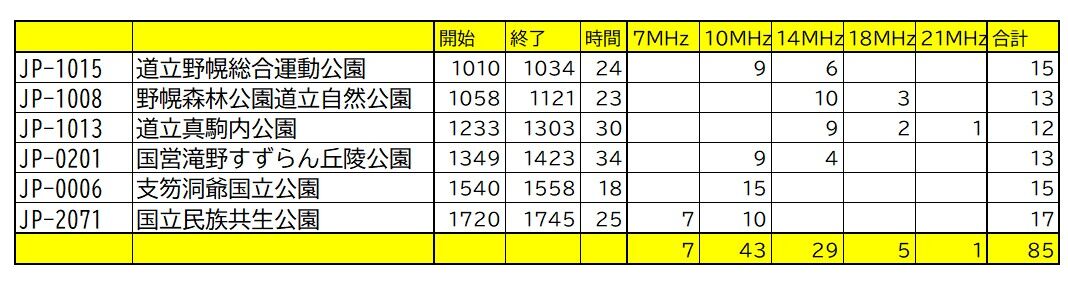 運用は、10時開始で野幌運動公園から7MHz FT8でスタートしましたが、予想通り、全く聴こえなかったので、10MHz➡14MHzとQSYしながらの運用。ハイバンドは国内はスキップしていたこともあり、昼頃は10~18メガが主体になりました。各公園の運用時間は30分程度と、まあ順調に交信できたと思います。