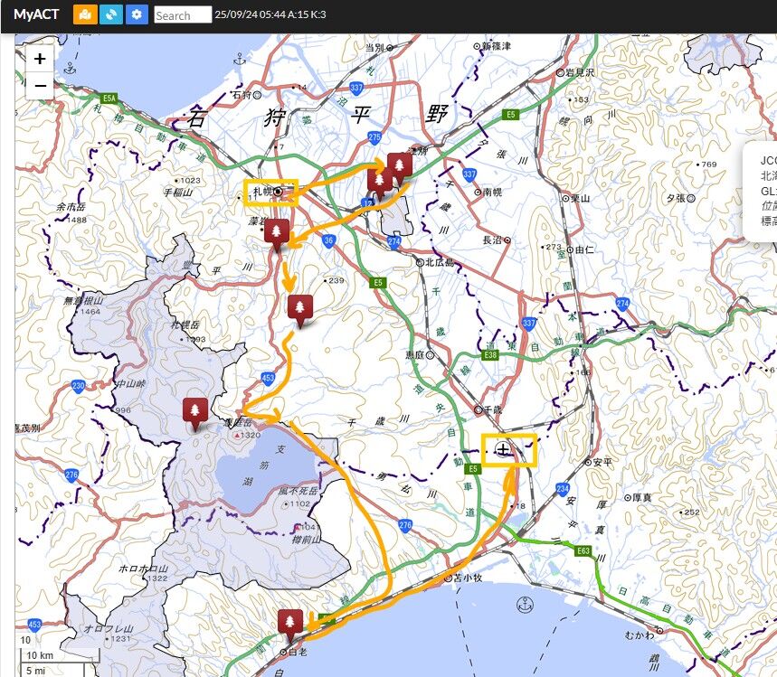朝からレンタカーで、札幌から支笏湖、苫小牧経由で新千歳空港まで、6か所の公園で無線移動。途中雨が降ったりもしましたが、青空も見え、鹿やキツネにも遭遇して気持ちよいドライブでした。ルートは、札幌から南下して、新千歳空港へ向かうルートです。