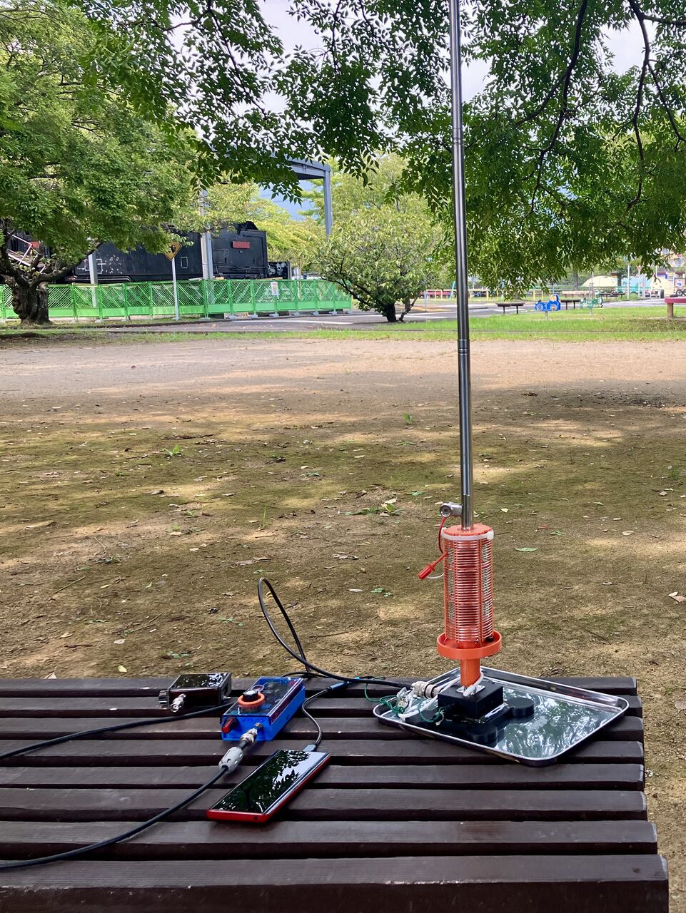 公共交通機関を使ったウォーキングで公園移動がきるコンパクトなアンテナを探していたときに簡単にバンド変更ができるGAWANTをもう少し飛ぶようにならないかと試行錯誤を繰り返して考案したアンテナです。10Wでも使用でき、内蔵のレベル計でチューニングができますのでSWR計なしで簡単にQSYができます。200か所以上の公園で実験運用を行い、コンディション次第ですが0.5W (主に7MHz FT8)でも80回以上のPOTAアクチベーション(一か所で10局と交信)に成功しています。