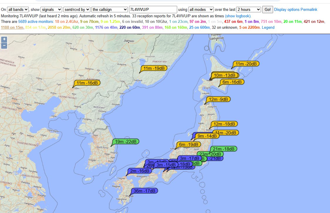 いつもの本州での移動と異なるのは、地理的にやはり北米によく飛ぶということです。東名阪エリアでの運用は、0.5Wで7メガだけでもACTできるのですが、北海道からは国内交信でも1000km以上になるので、このアンテナでは、5W程度必要です。呼ばれなくなったら周波数も適宜変更して各公園で2~3バンド運用するのがよさそうです。