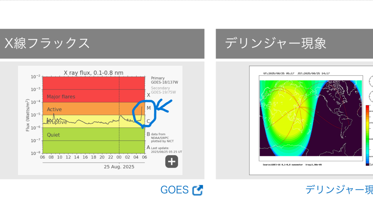 太陽黒点の高い夏場なので、運用前に太陽フラックスの リアルタイムグラフ をチェックします。このグラフは太陽からのX線を示しているのですが、図の青丸で囲んだようなオレンジの領域以上になるとデリンジャー現象となり40mも30mも国内はほぼ聴こえなくなります。今回は、SSNが300近くになっていることもあり何度かこういう場面がありました。そして、黄色のレンジでも急にグラフが立ち上がったりすると急激にコンディションが低下するのでグラフをみながら40mの信号を受信すると実感できるのでお試しください。これらは数十分待てば回復することが多いので事前にチェックしてダメそうだったら先にランチや観光などしておくと時間を有効に使えます。もちろん設備が良ければ、影響の少ないハイバンドでDX狙いで交信をしてもよいと思います。