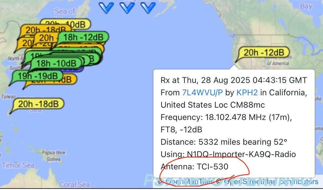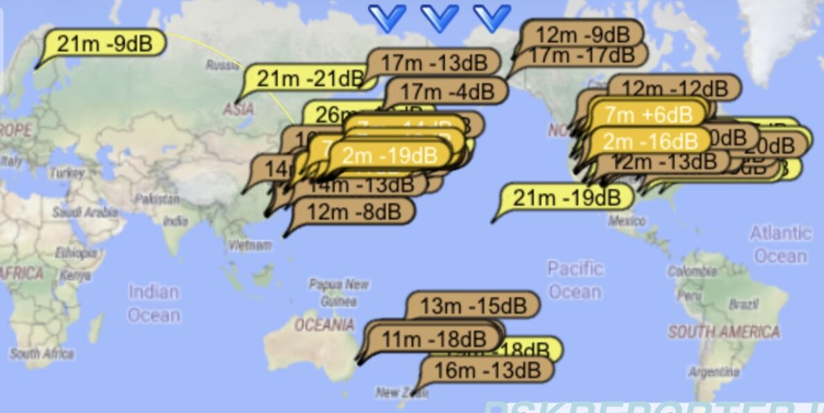 移動から戻ってPSKRをみていると、北米まで飛んでいることが分かりました。5Wであればたまに北米やオーストラリアは交信できることもあるのですが、流石に0.5Wなので驚きました。ここに記載されている 受信側のアンテナを調べると業務用のようなでかいアンテナ でした。