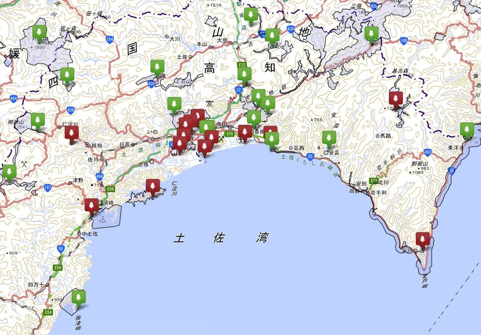 高知県にはPOTAの対象公園が何と39か所もあります。今回は20公園くらいを予定していたのですが、トラブルもあり予定を変更して下図(赤色印)の15公園をまわりました。