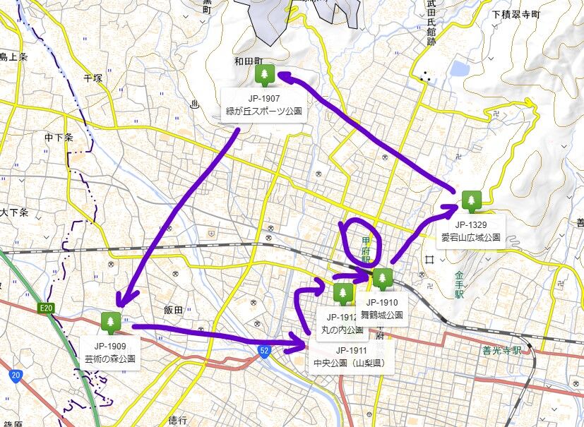 今回のルートは、甲府駅から徒歩で回る1日コースで6公園をまわります。いつものように歩く距離は10km程度、約2万歩で計画しています。今回、8時45分に甲府駅をスタートして、ゴールは14時過ぎくらいでした。