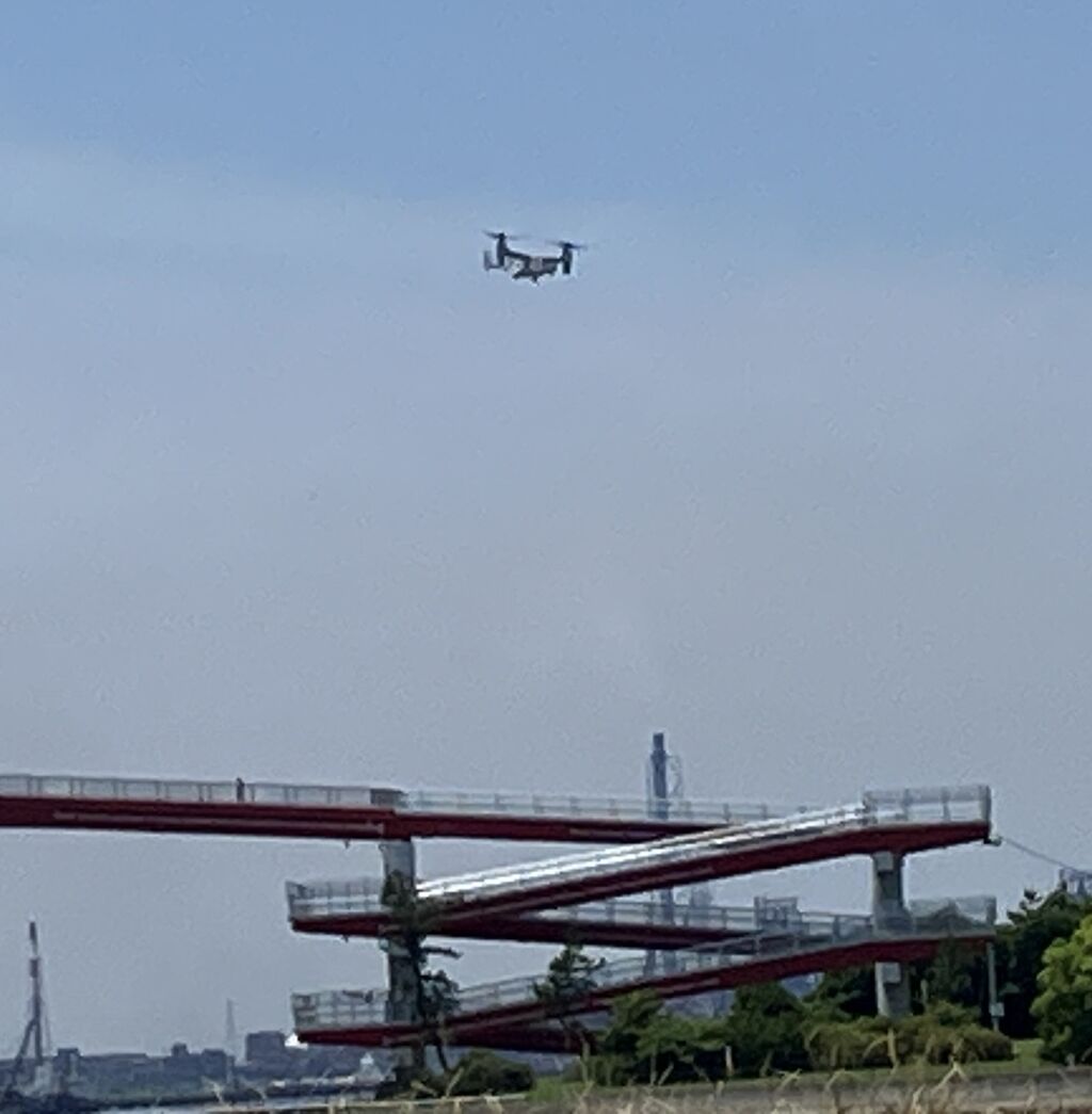 木陰がないので強烈な日差しの下、コンディションも悪く40mだけではダメで17mも運用しました。この陸橋は両側を大きな螺旋がありますが車も通れるようになっています。陸上自衛隊が近くにあるためヘリコプターやオスプレイが数分おきに通ります。